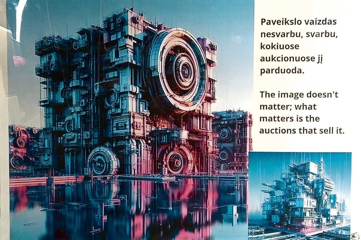 Tomo Lagūnavičiaus kūrinys generuotas naudojant DI įrankį „Paveikslo vaizdas nesvarbu, svarbu, kokiuose aukcionuose jį parduoda“, 2025 m.