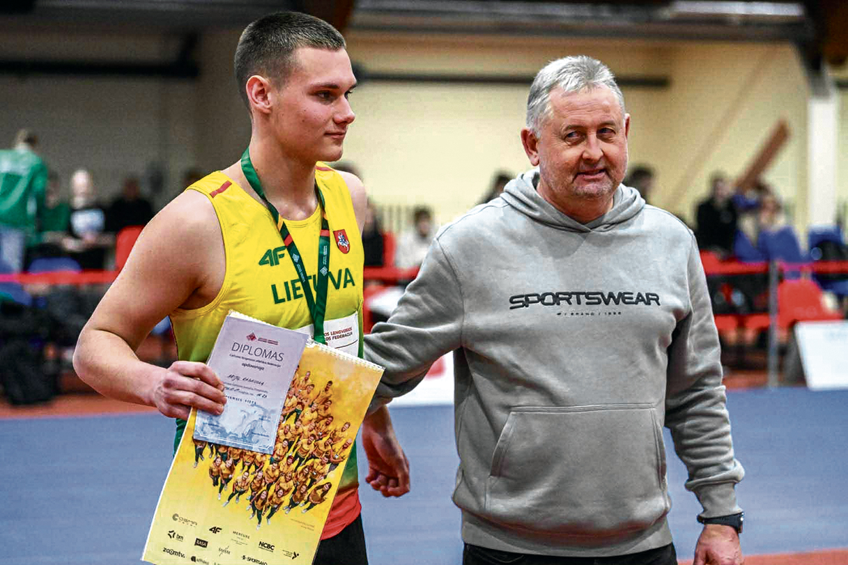 Lietuvos jaunučių čempionas Arijus Ragauskas su treneriu Viktoru Bagamolovu. Nuotr. Lietuvos lengvosios atletikos federacijos