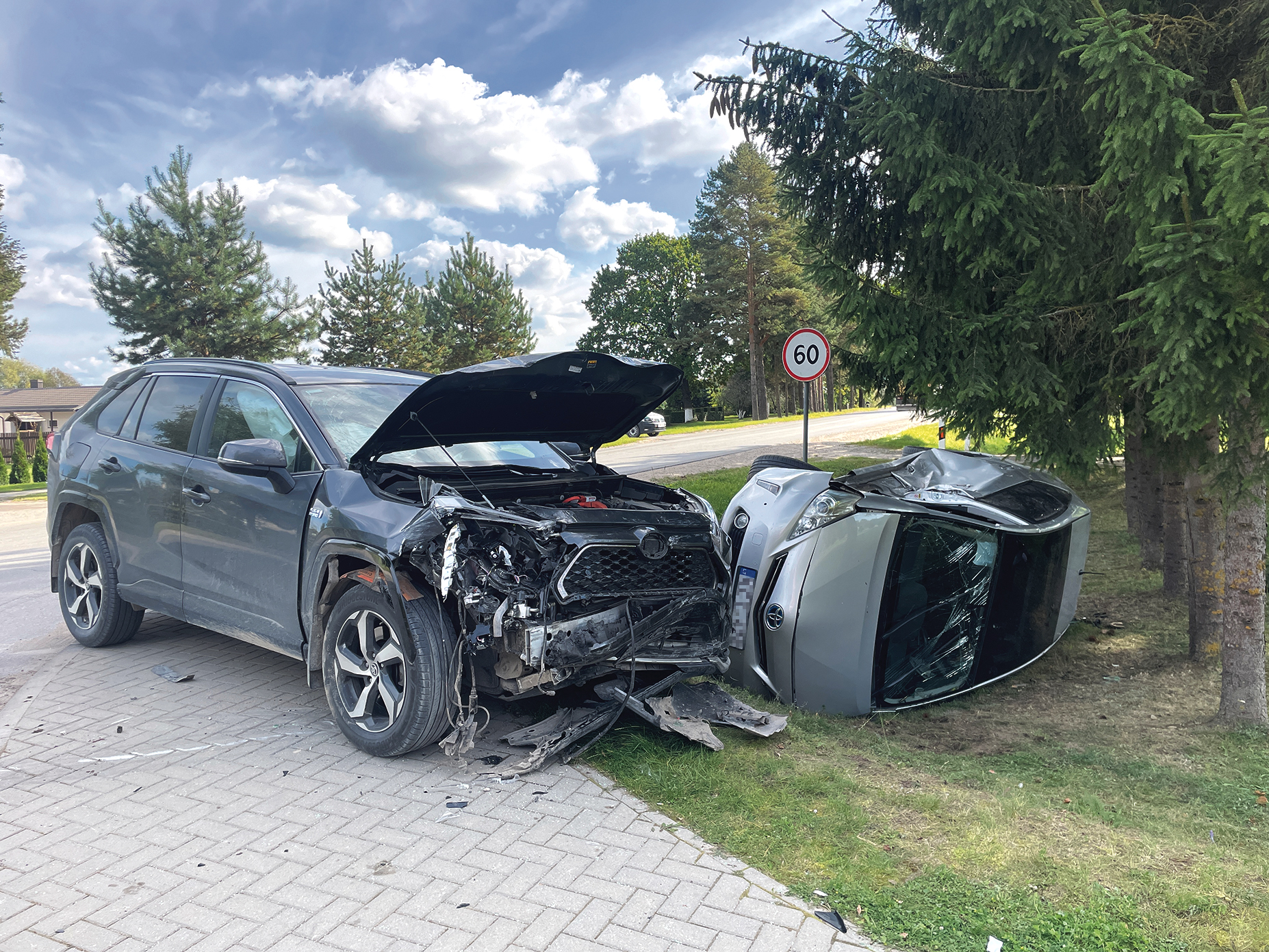 Smūgio būta stipraus, stumiamo „Toyota Prius“ automobilio ratai kliudė šaligatvį, dėl ko automobilis virto ant šono ir atsidūrė pakelės griovyje.