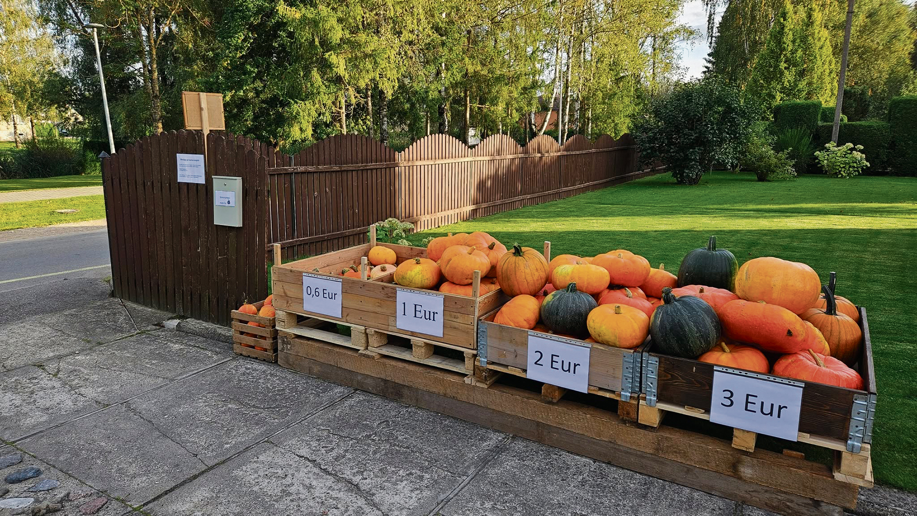 Turgelyje galima įsigyti moliūgų pagal dydį ir kainą. Siūloma išsirinkti patikusius, o pinigus už juos įmesti į šalia esančią dėžutę arba pervesti į nurodytą sąskaitą.