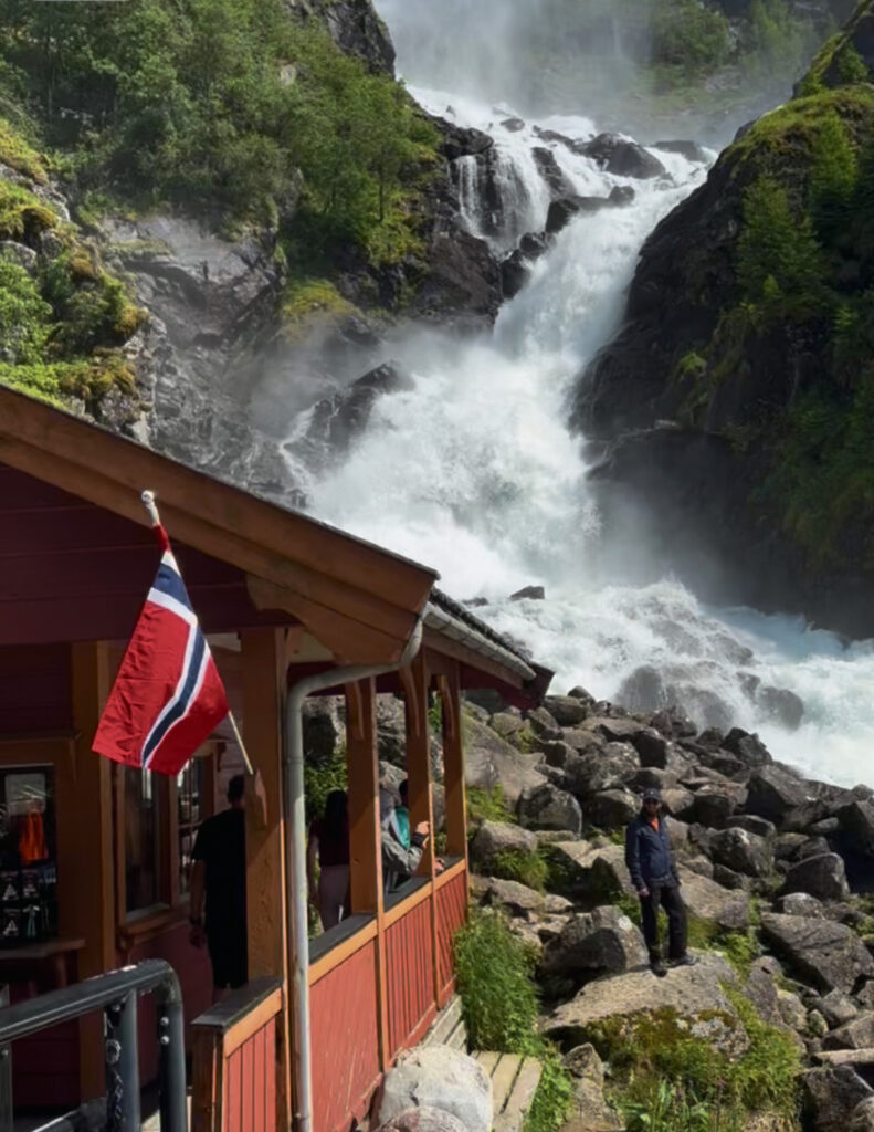 Lietuviai mėgsta keliauti po Norvegiją. Vienos iš išvykų metu šalia įspūdingo krioklio. Nuotr. asmeninio albumo