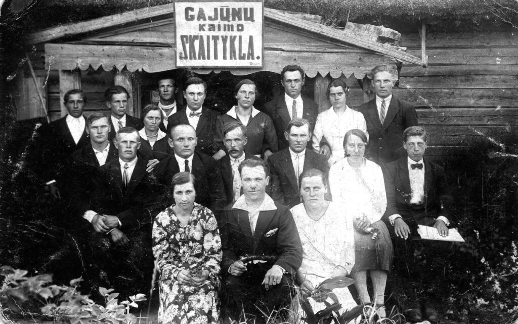 Grupė vietinių prie Gajūnų kaimo skaityklos pastato. Fotografavo Jonas Variakojis iš Gajūnų kaimo. Sėdi iš kairės: Olga Variakojytė (skaityklos vedėja, į skaityklą atnešdavusi knygų iš Laužadiškio pradžios mokyklos), Jonas Baltušis (perleidęs seklyčią skaityklai), Stefa Lukšytė. Antroje eilėje: Povilas Patkauka (su kaklaraiščiu), mokytojas Jokūbas Šernas, Mykolas Šlėgeris, Povilas Macys, Ona Lukšytė, Povilas Januševičius. Trečioje eilėje: Motiejus Valkiūnas, Sadauskaitė. Ketvirtoje eilėje: Juozas Misiūnas, Jokūbas Patkauka, Jonas Stikleris, Motiejus Čereška, Ona Čereškaitė, Mykolas Čereška, Julija Baltušytė, Alfonsas Lukšė. Gajūnų kaimo skaitykla – pirma vieša skaitykla Biržų valsčiuje ir apskrityje, įkurta 1924 m. lapkričio 8 d. Pagrindinis skaityklos steigėjas – Jonas Variakojis, o šelpėjas – amerikietis Mykolas (Michael) Stakėnas. Nuotrauka iš Biržų muziejaus „Sėla“ fondų
