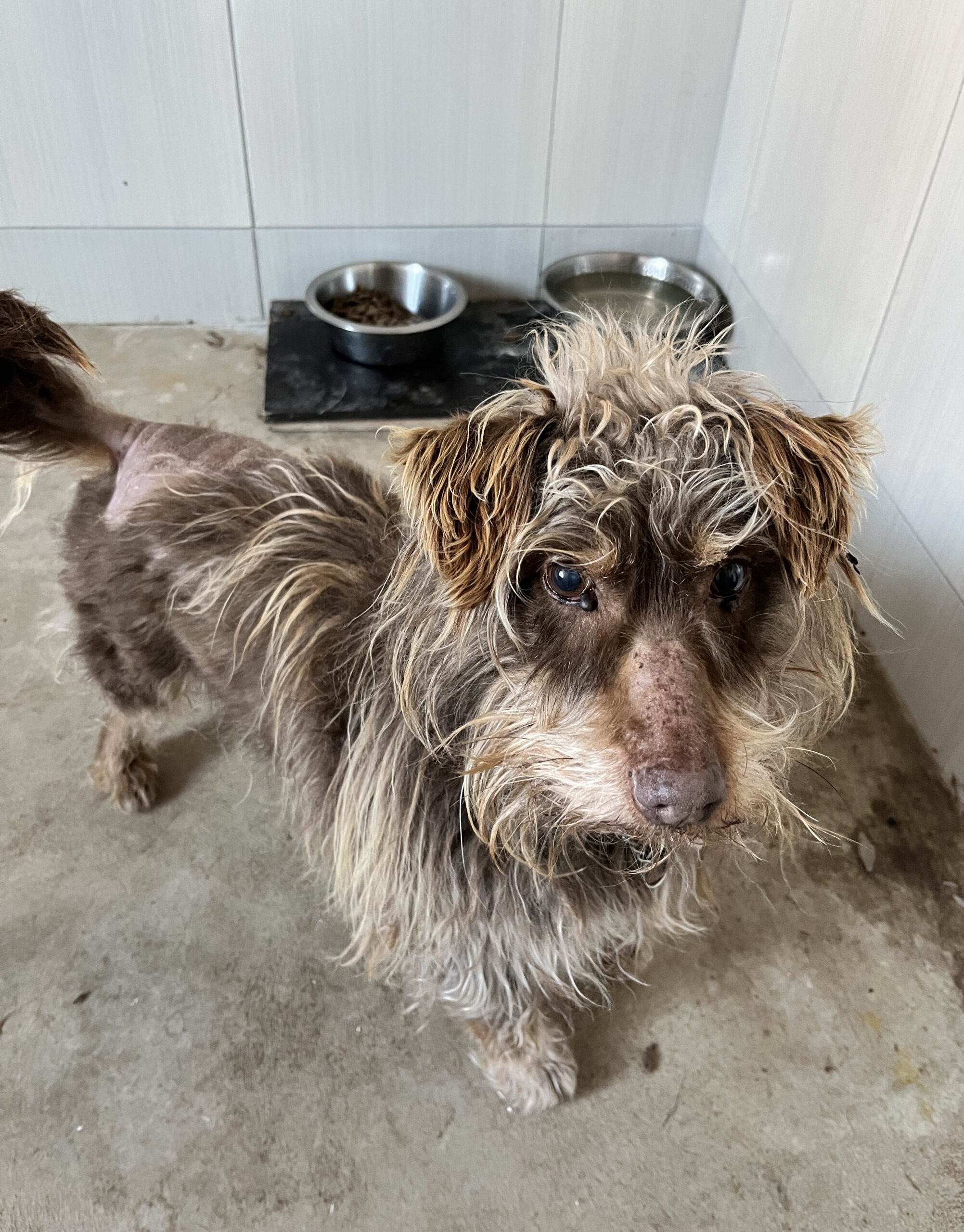 Gyvūnų globos namų darbuotojams šunelį atvežę žmonės pasakojo, kad jie patys sustiro, kol bailų ir agresyvų, žmonių meilės nepažįstantį šuniuką jiems pavyko prisivilioti.