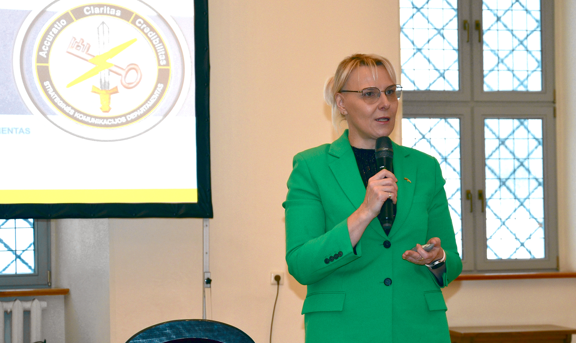 Lietuvos kariuomenės Strateginės komunikacijos departamento patarėja Auksė Ūsienė kalbėjo apie prieš mūsų valstybę ir visuomenę nukreiptas informacines operacijas, kurias vykdo Rusija ir Baltarusija. Nuotr. Petro Gudo