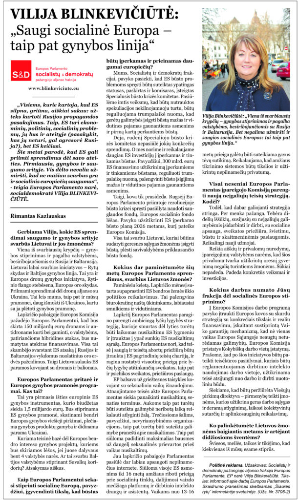 3. Už politinės reklamos skelbimą mokantis subjektas: Socialistų ir demokratų pažangiojo aljanso frakcija Europos Parlamente Europos Parlamento narė Vilija Blinkevičiūtė Rue Wiertz 60, B-1047 Bruxelles ASP 11G265