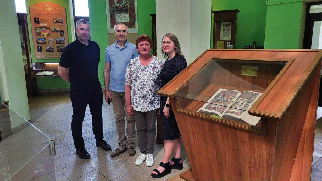 Rivnės rajono vadovai ne kartą bendravo su Všį „Pirmoji pagalba Ukrainai“ atstovais Giedriumi ir Oksana Mociūnais. Čia jie Peresopnicos vienuolyne, kur buvo sukurtas senosios ukrainiečių kalbos ir meno paminklas – evangelija. Nuotr. asmeninio albumo